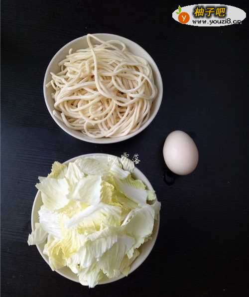 备好食材:鲜面,白菜,鸡蛋;白菜洗净,撕成小块;