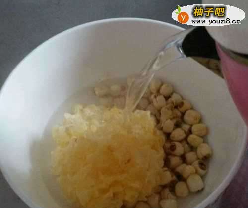 4将银耳莲子放在碗中,加入适量清水,然后大火烧开~