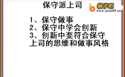 3第三,对于灵活多变善于抓住各种机会去发展公司的上司,那么需要思维多变,学会创新,多想一些推动公司发展的点子,为公司谋取更多的利益,这时会得到上司的重视。