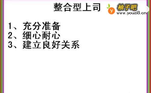 4第四,如果上司是整合型的,那么我们在做工作前一定要做好充分的准备,要细心并耐心,及时与上司沟通,与上司建立好关系。