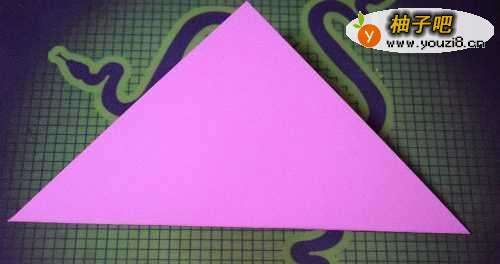2沿着其中一条对角线折过去,正方形折成一个大等腰三角形。然后再从中线对着一次,折成一个小等腰三角形。