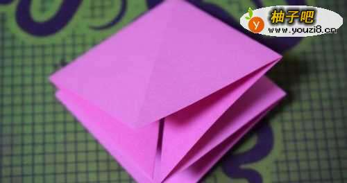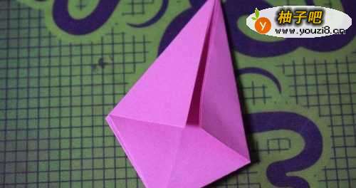 6百合花的折法图解。沿着中线把其中两个角折起,然后翻到背面,同样方式执行一次。