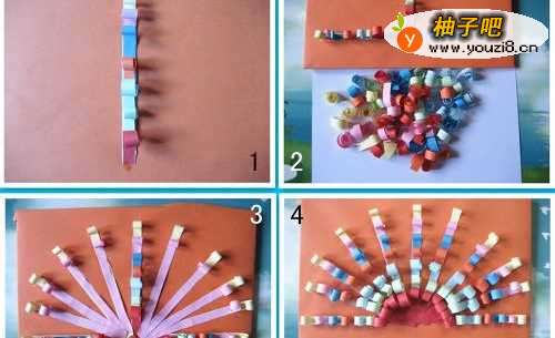 利用不用颜色纸条来制作孔雀的大尾巴。Marine用了7种颜色,做好后,尾巴共有7层。