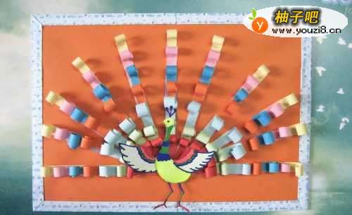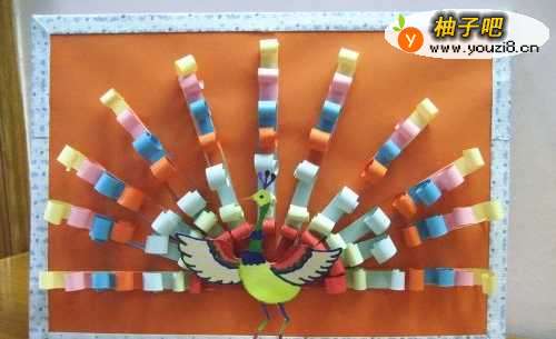 嗯,漂漂亮亮的孔雀开屏粘贴画可就完成了哟!五颜六色的,真好看!!