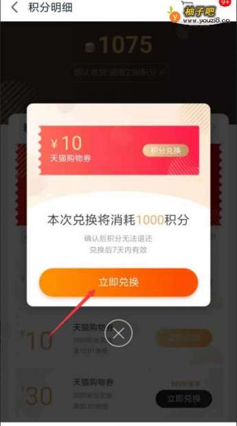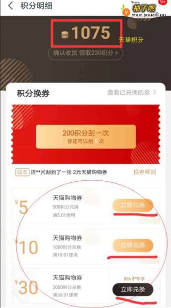 5然后上面的数字就是你该账号的目前所剩余天猫积分。现在有三种优惠券,1000积分对应的时10元优惠券。点击立即兑换,就能获得相应的数额优惠券