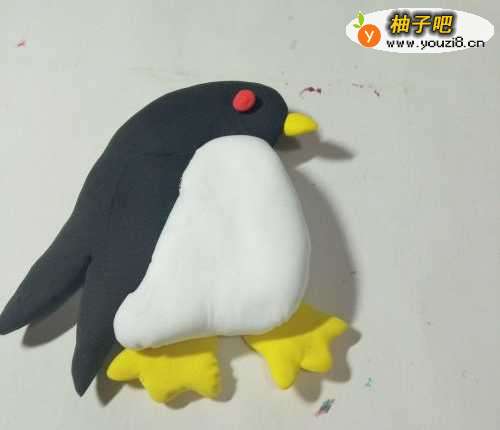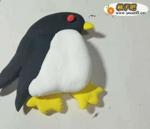 6最后我们再把企鹅下面的黑色彩泥用工具切开做成它的小翅膀就完成了。