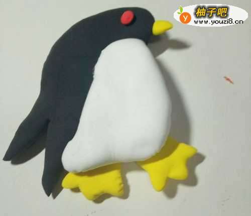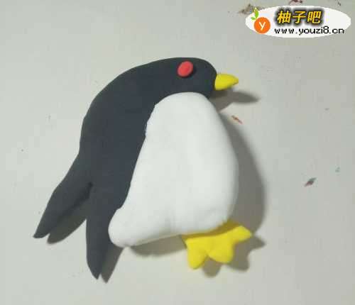 4然后我们再用黄色的彩泥做一个三个分叉的脚粘在企鹅身体的下面