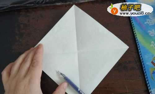 准备好正方形的白纸,一直黑笔。先把纸的两角对折,然后再把上边的角向下折,如图。