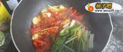 44、倒入少点油,把麻辣酱放入锅里炒一炒,再把切好的佐料;葱花,辣椒,放入锅里。