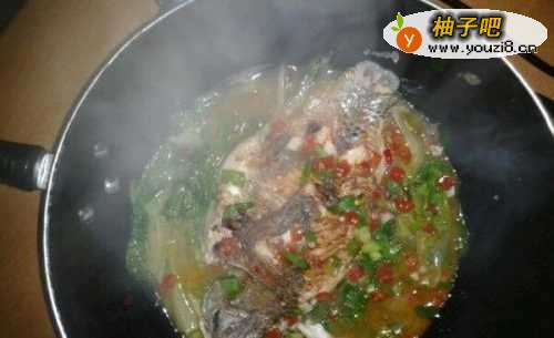 66、接着上一步,加了水关到中火,就是盖上锅子,加水和盖锅子的由来就是让味道能更多的进入到鱼里。待水干了,就能出锅了。