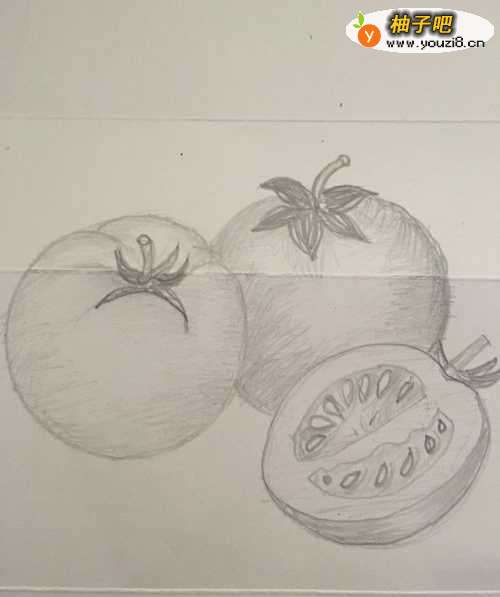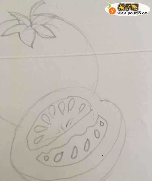 4第四步 再画上一个切过的半个西红柿衬托一下画面