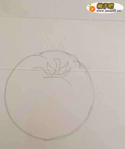 2第二步 根据圆形 再画出西红柿的基本轮廓 画出叶子 和枝梗