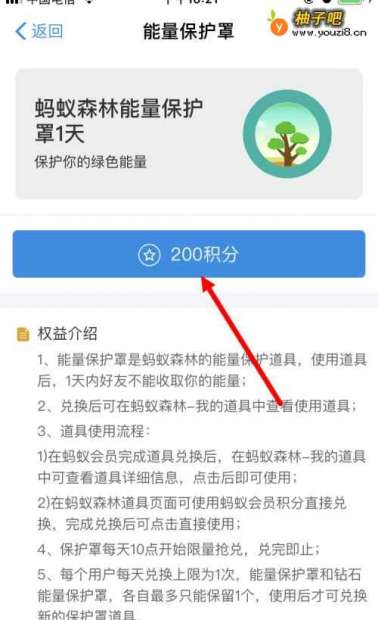 这种方式是用200蚂蚁积分,兑换1天的蚂蚁森林能量保护罩。