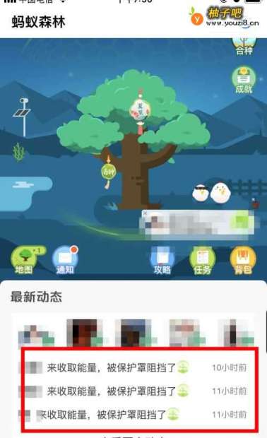 10设置保护罩后,我们还能在 最新动态 里面看到被阻挡的收取能量记录。很有意思。