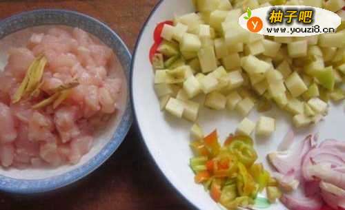 鸡脯肉切丁用盐和姜丝腌一下,土豆去皮切丁,洋葱青红椒切碎