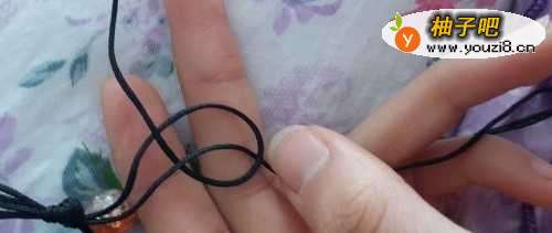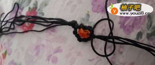 7然后再拿一段10cm长的绳子把他系在两端绳子交叉的中间,如图的编织一点点,和前面固定珠子的编织思路是一样的,最后打结,用火烧一下。