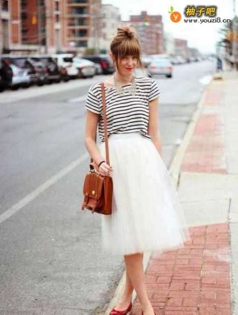 搭配四:白色网纱裙+黑白条纹短T这款黑白条纹T恤是非常洋气又显高挑的,搭配一条白色网纱裙是很有公主范儿的呢。