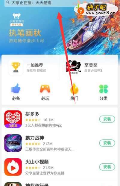 我们启用手机中的应用商店,进入应用商店后,我们点击上方的搜索框按钮。