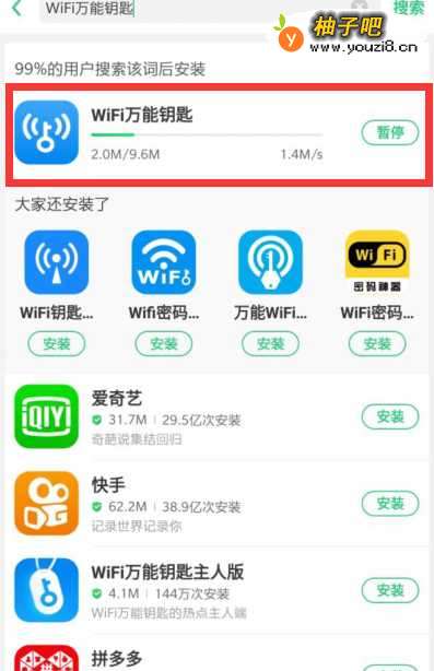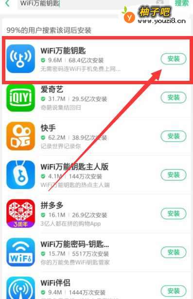 3我们能看到匹配出的第一个应用便是我们要找的“wifi万能钥匙”。我们点击后方安装按钮,进行安装。