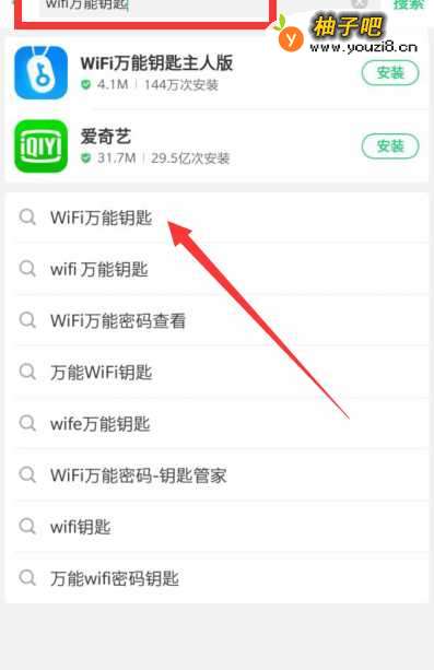2在搜索框中输入软件的名称“wifi万能钥匙”,即可匹配出与万能钥匙相关的一些应用和一些要害词,这里我们点击名称为“wifi万能钥匙”的要害词。