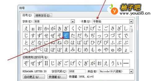 4在“子集”中选择“平假名”,并在下方选中平假名ぞ,点击“插入”。