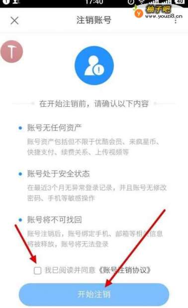 6这时我们直接勾选上账号注销协议,点击开始注销按钮即可。