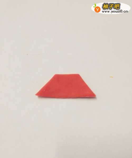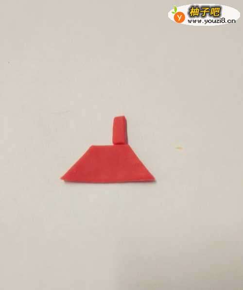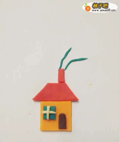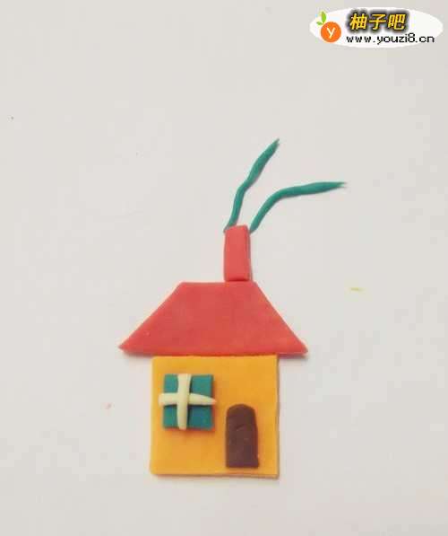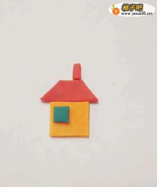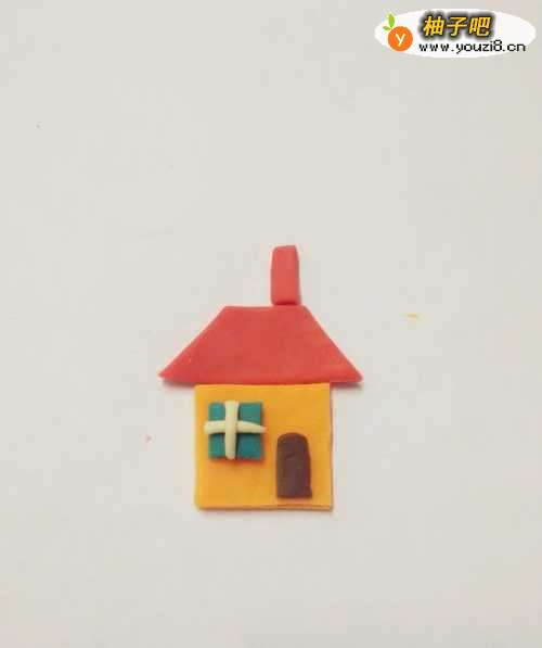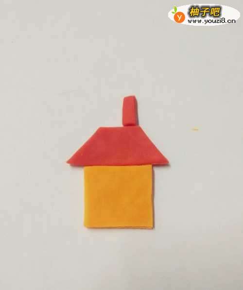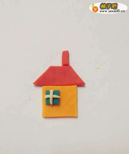 3再用一小块红色捏成长方形,粘在房顶上,当作烟囱。
