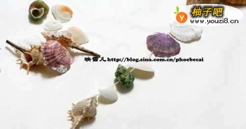 9同样的思路我们穿入其它的贝壳。每个贝壳之间都要留一定的间距。选一些带色彩的贝壳,或是让孩子给贝壳涂上鲜艳的颜色会更加漂亮。