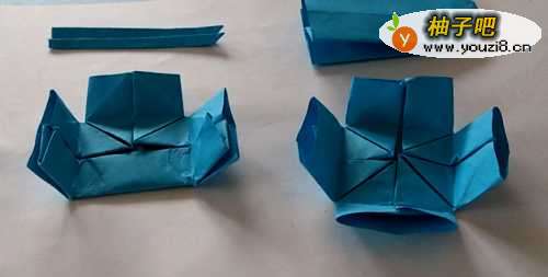 长方形纸对折两次,然后将一端的角折叠进去(做两条)。