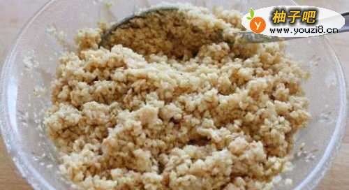 4把白糖、黄油倒进芝麻里搅拌均匀
