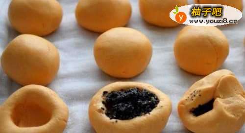 6面团分成小剂子,将芝麻馅包进去