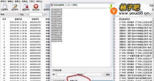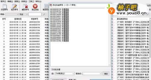 22:点击‘添加单号’,在文本框中输入快递单号和快递公司中间用逗号 , 隔开. 输入时要注意一行只能一个,必须要有快递单号和快递公司