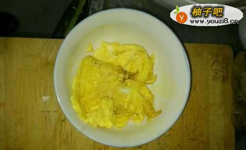 2锅内倒入油,将鸡蛋炒熟,倒入盘中备用;