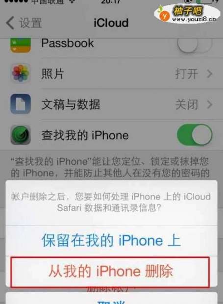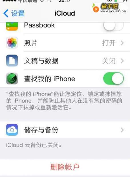 4如果想要更换新的ID账号,首要你的就是要清除注销现有的登陆账号,也就是在iCloud界面最下面,点击删除账户。