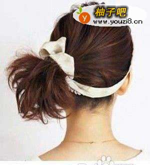 白色的绸缎式发带为发型点缀出甜美的感觉,而简单的蓬松侧扎发营。