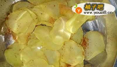 5接着,撒上孖然粉,喜欢辣味的能添加少许辣椒粉。搅拌几下,让调味料均匀的裹在土豆片上。