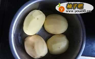 3接着,将土豆侵泡在放入适量盐的水中10分钟,去除多余的淀粉。