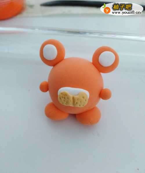 4搓两个小圆球做出小老虎的两个爪子,白色粘土制作老虎的嘴部