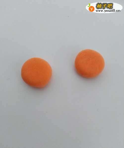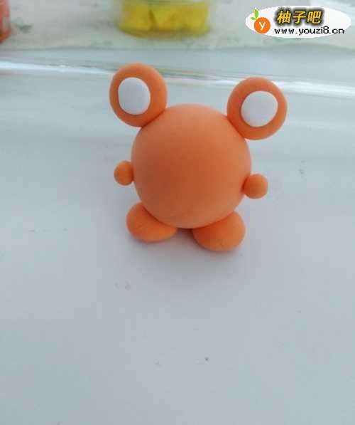 3另取小团粘土分成等大两份,搓成圆球后压扁,之后取白色粘土,制作两个小圆片,粘在橙黄色圆片粘土的中间,制成两个耳朵,粘在小老虎头顶