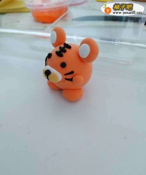 7黑色粘土,搓成细条,制作小老虎腮部的胡子和两个眼睛,粘土小老虎就做好啦