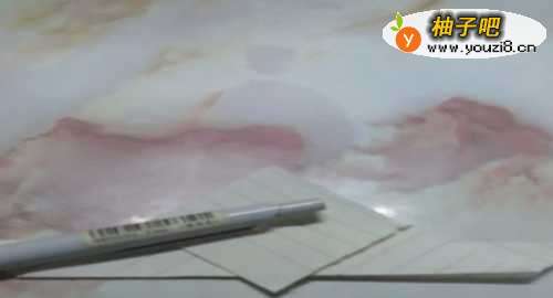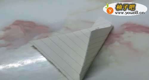 3再翻回到正面,把下面的三角形顺着印记向上折,如图。把顶角部分往下折,折到超过底边一个小角刚刚好。如图。(铅笔是用来压着纸的)