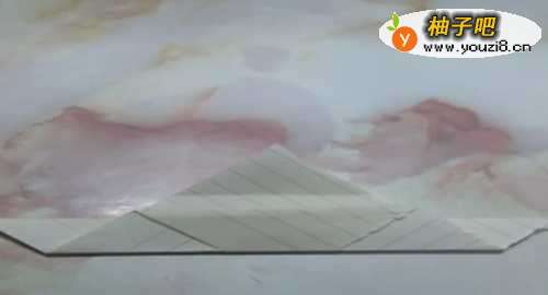 首先准备一张正方形折纸(图片压缩过了,像长方形),对折成一个等腰三角形。将底边向上折,形成一个小船的形状,如图。
