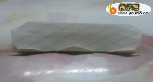 5随后将底边两个角部分按着印记往下折,如图。再将刚好折好的部分再次顺着平行的印记翻折,形成一个规则的带小角的矩形形状,看图比较简单。