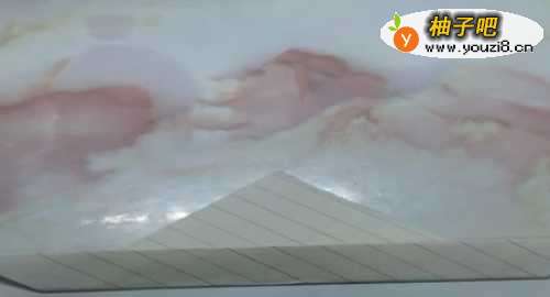 2接着将正面翻到反面,顶角部分有两张纸,顺着往下折,形成小正方形,如图。