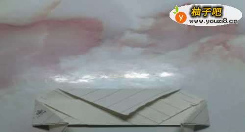 6最后把矩形的两个底角向上折,如图。再次翻折到背面,将伸出来的两个小角平行着矩形的边往上折,如图。然后再把两个小角往上折,形成两个基座,如图。