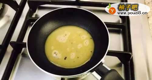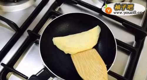 3小型平底锅用厨房纸抹入一层油,锅微微热时就能放入一勺蛋液