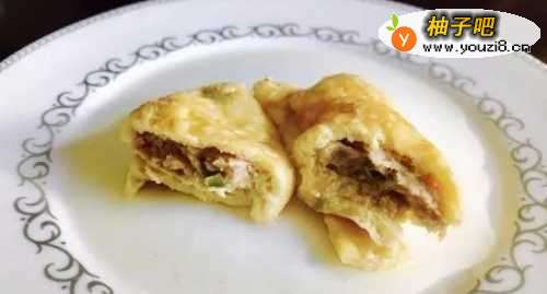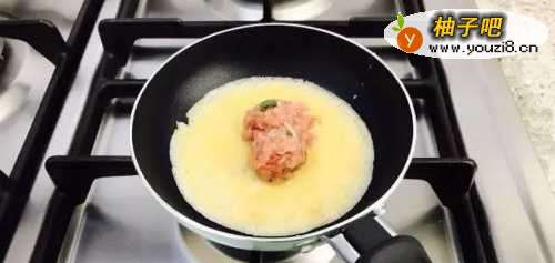 4蛋液均匀成半凝固时放肉馅(有破口能加点蛋液),停留几秒钟定型后用木铲掀起一边对折蛋皮