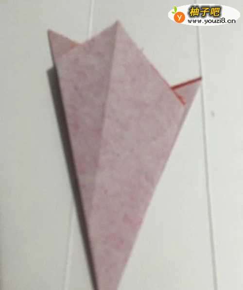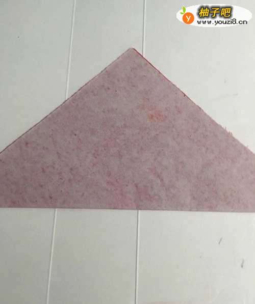 第一步把一张16厘米X16厘米的正方形红色彩纸 从下向上对角折叠整齐