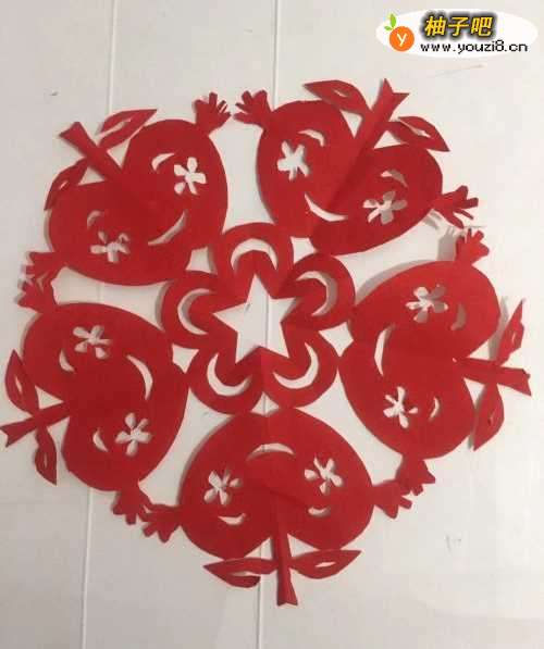 6第六步 剪去外围多余的彩纸之后 再剪里面细致的部分 卡通苹果的枝梗 叶子 拟人笑脸 花纹等等 剪完之后 取开铺平 一副漂亮的卡通苹果团花图案就裁剪完成了