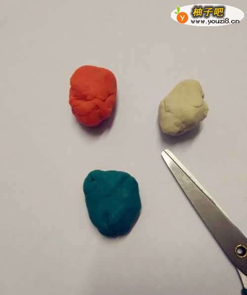 准备桔红、蓝色和白色的彩泥和剪刀。